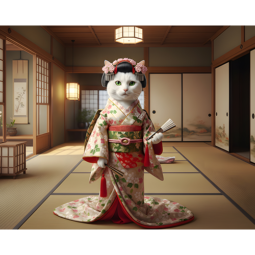 Inside a tranquil Japanese-style room illuminated by soft lantern glow, Nora takes on the role of a graceful geisha, dressed in an ornate kimono filled with floral detail. Her calm expression and poised stance reflect a world of quiet elegance and timeless beauty, where every element enhances a sense of peace and refinement.