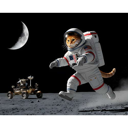 Nick, the adventurous red tabby, takes his moonwalk to the next level — literally! Clad in his space suit, he bounds across the lunar surface with confidence and curiosity. The rover waits behind him as he explores a world filled with silence, stars, and whiskered wonder.