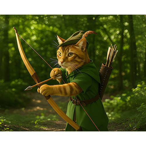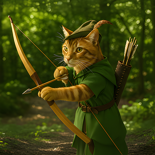 In this adventurous scene, Nick the red tabby cat channels the spirit of Robin Hood. Standing in a sunlit forest with his bow and quiver of arrows, Nick blends feline focus with classic heroism. This whimsical portrait captures the courage, cleverness, and charm that make him both outlaw and legend.