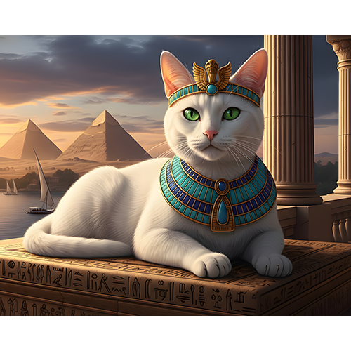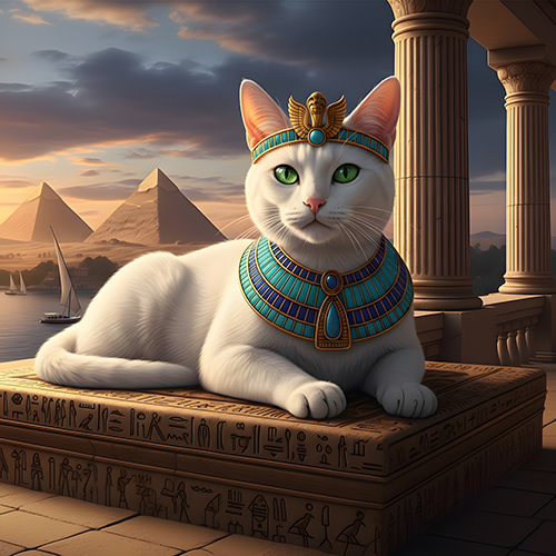 Behold Nora as Cleocatra — regal, graceful, and commanding beneath the Egyptian sun. Wearing intricate turquoise and gold adornments, she lounges on a carved stone ledge overlooking the Nile and pyramids. Her calm expression and royal posture capture both elegance and strength in this captivating feline portrait inspired by ancient majesty.