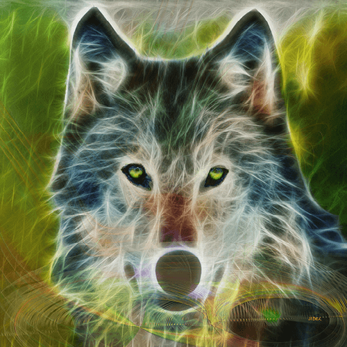 This dog/wolf art was created 2013. Quiet Majesty is a portrait of a magnificent wolf. It's natural majesty made naming this work easy. This art is done in a new version that is "Fractalized". This means that the hidden fractal components that made up the original art, are expanded to give the piece a totally different look. This technique is almost like painting with light.