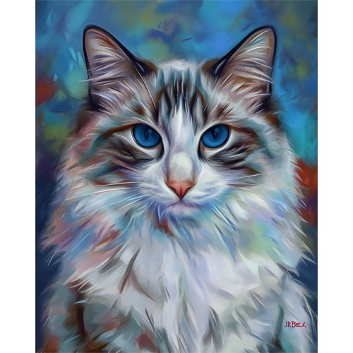 Regal Ragdoll (2026) is a serene portrait celebrating the beauty of the ragdoll cat. Known for their striking blue eyes and luxurious fur, ragdolls are often admired for their calm and affectionate nature. In this artwork, soft brush textures and delicate color tones create a dreamy background that complements the cat’s expressive face and gentle presence.